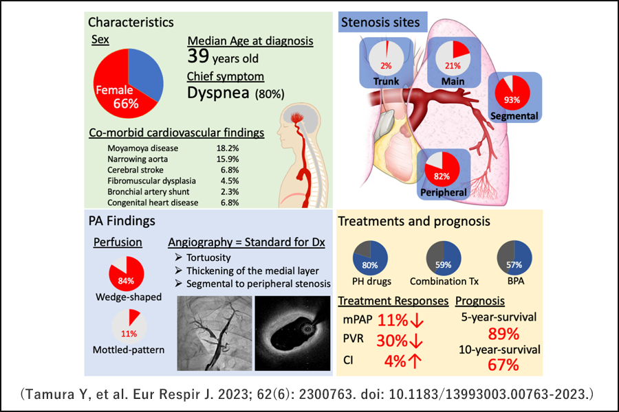 本研究は、超希少疾患である成人発症PPS患者の臨床データについて多施設で多くの症例数をまとめた世界初の報告であり、European Respiratory Journal誌に掲載された(Tamura Y, et al. Eur Respir J. 2023; 62(6): 2300763.)。明らかになった臨床的特徴から、成人発症PPSの疾患概念を確立し、今後の治療の標準化や新規難病指定に貢献することが期待される。今回の研究を契機に成人発症PPSの疾患概念の普及と診断が進むだけでなく、臨床研究や病態に関する基礎研究を促進する基盤的研究となることが期待される。
