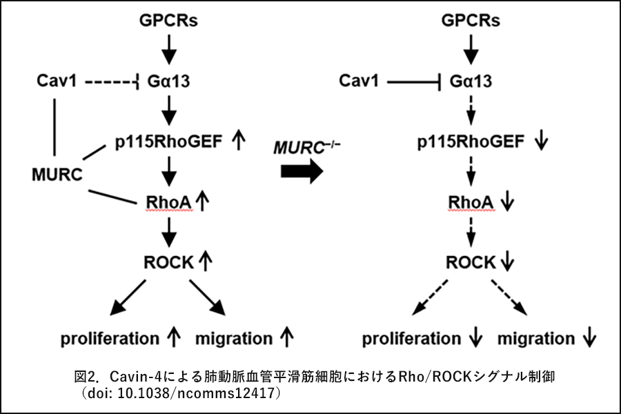 そこで我々は、以前に自ら単離・同定したカベオラ関連タンパクMURC/Cavin-4とPAHの関係について探索を行った。Cavin-4は筋細胞特異的に発現するカベオラ関連タンパクであり、肺では血管平滑筋細胞に特異的に発現している。CAV1−/−マウスは常酸素下でもPAHを発症するが、Cavin-4−/−マウスは発症しなかったため低酸素暴露肺高血圧モデルを作成し検討したところ、全身Cavin-4−/−マウスでは肺高血圧が減弱することが明らかとなった。これは平滑筋特異的Cavin-4−/−マウスでも同様であった。ヒト肺動脈血管平滑筋細胞のCavin-4をノックダウンすると増殖能・遊走能が低下することも明らかとなり、さらにCavin-4はG タンパクの一つであるGα13とCAV1の結合に競合阻害することにより、Gα13/p115RhoGEF/RhoA/ROCKシグナルを介して肺動脈血管平滑筋細胞の増殖・遊走を制御しているという新たな肺高血圧症の発症・進展メカニズムを発見した(図2。提出論文1)。Cavin-4は、肺高血圧症においてCAV1の機能を抑制する方向に働いており、PAHの進展に寄与している可能性を示唆する発見であった。